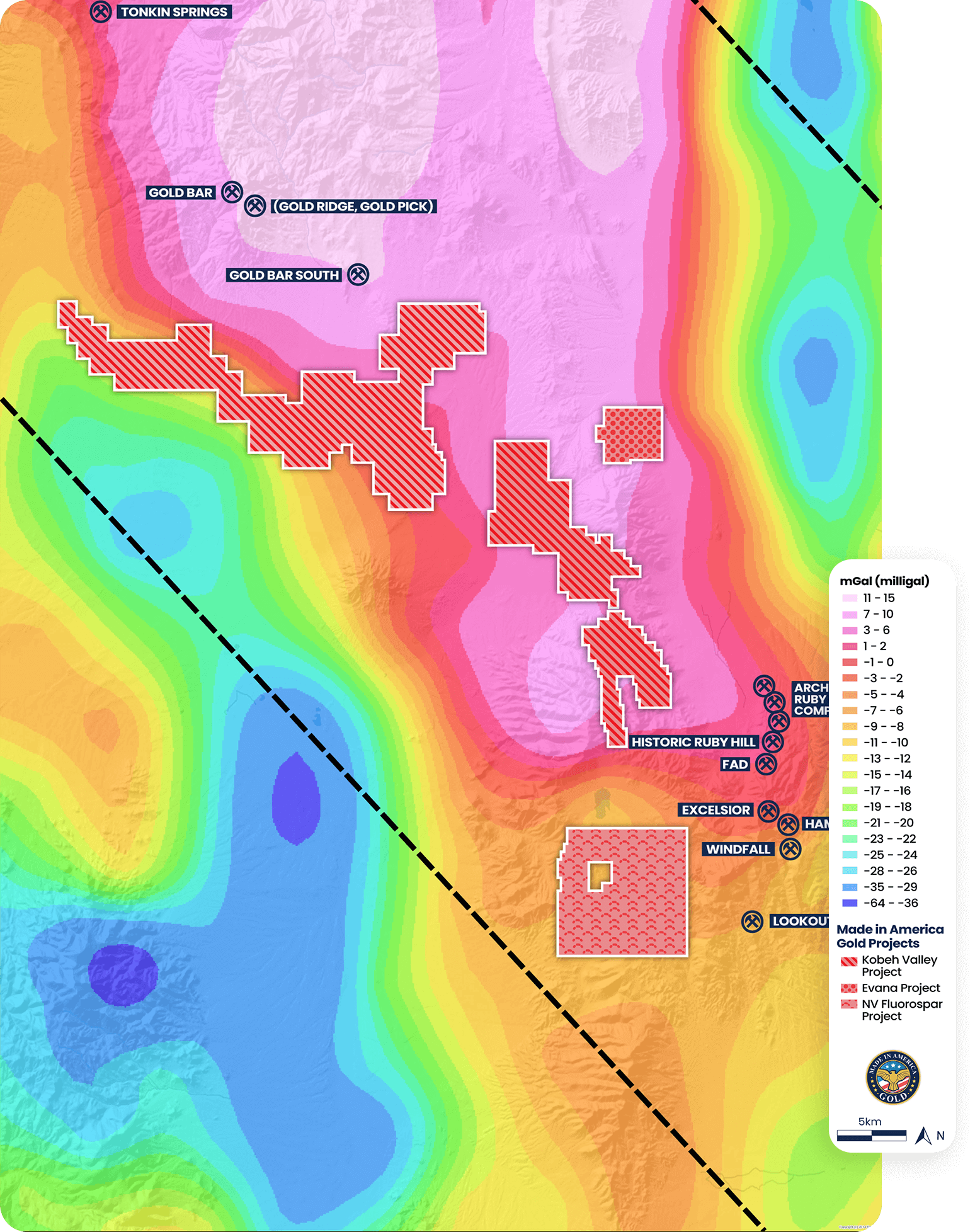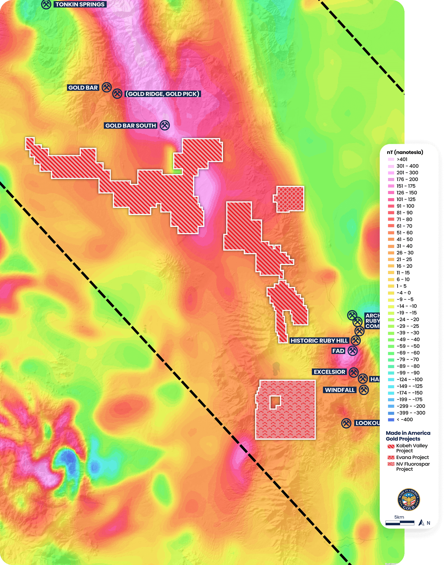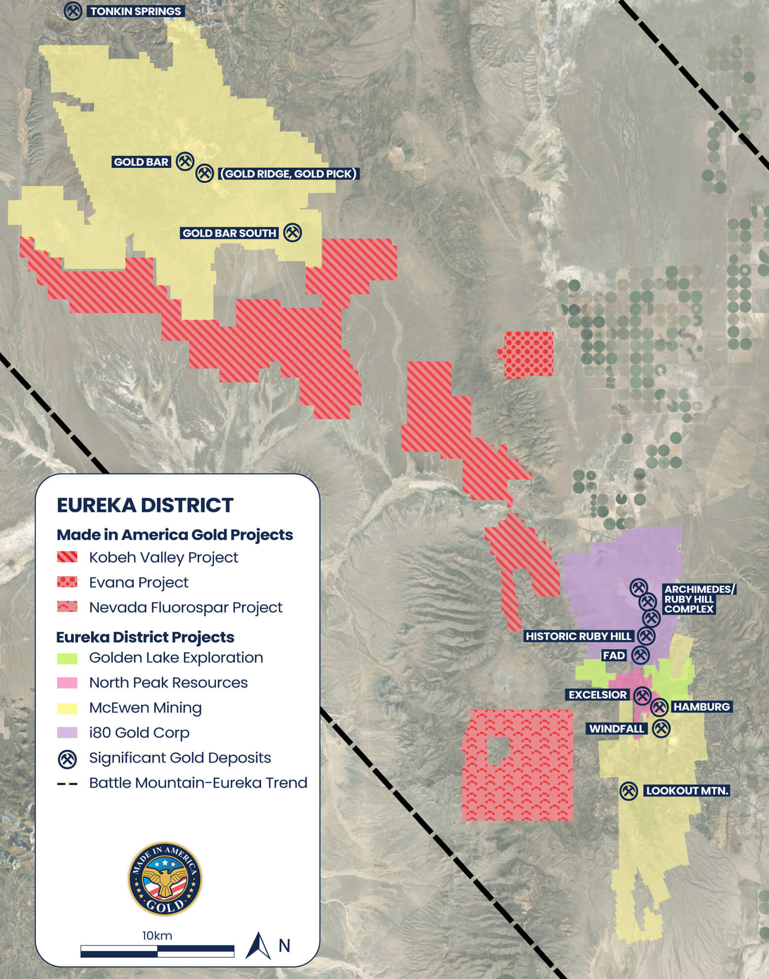 Made in America Gold’ three district-scale projects (Kobeh Valley, Evana, and NV Fluorspar) make it a central figure in this burgeoning district.